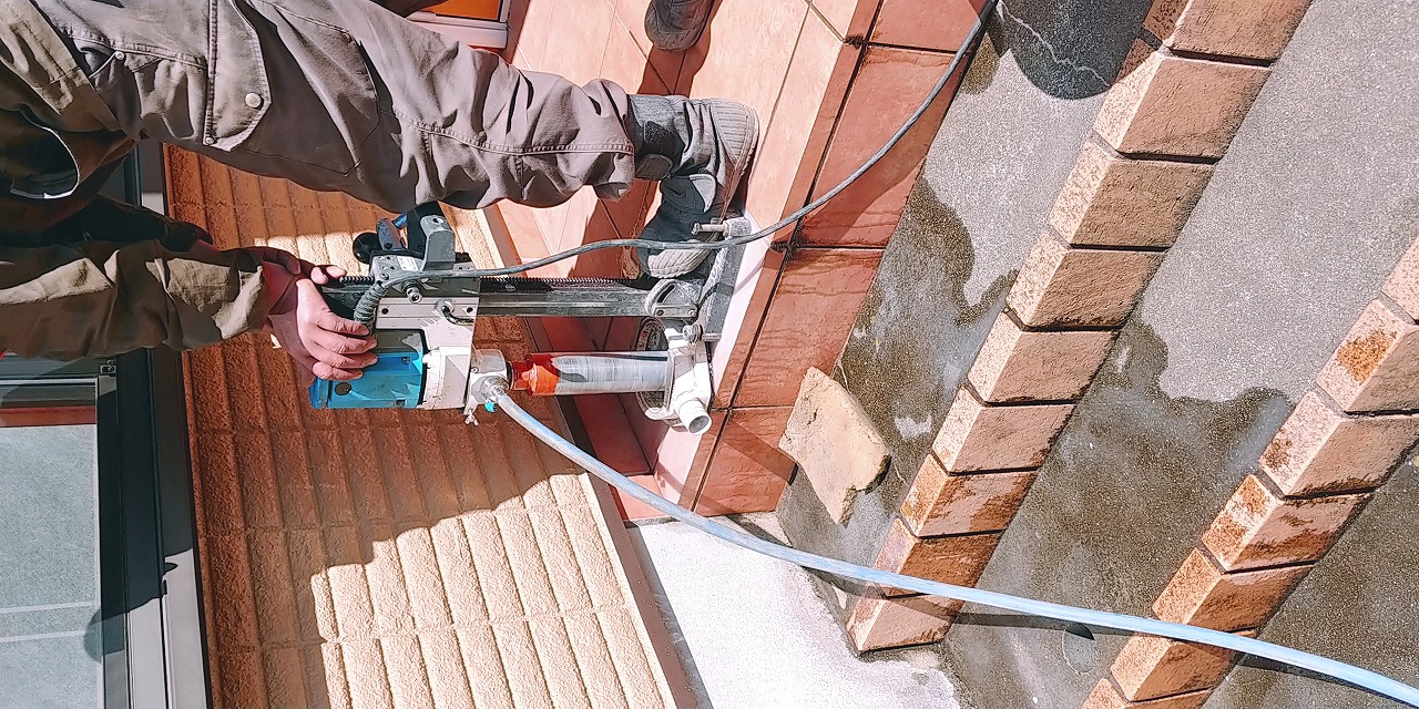 ダイアモンドコア抜き機なる機械を使って、固い部材に穴を開けていきます。