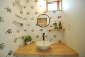 ハリネズミ柄がとても可愛いこちらのセカンド洗面♪横壁には2つのニッチと、前壁には棚も完備。