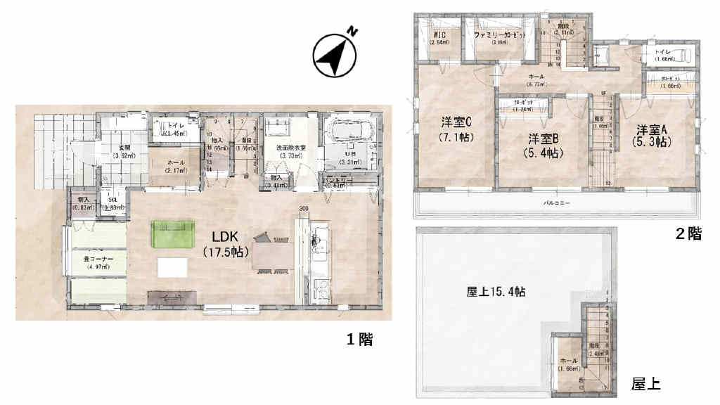 | 間取詳細 | (1階)LDK17.5、(2階)洋5.3、(2階)洋5.4、(2階)洋7.1 | ||