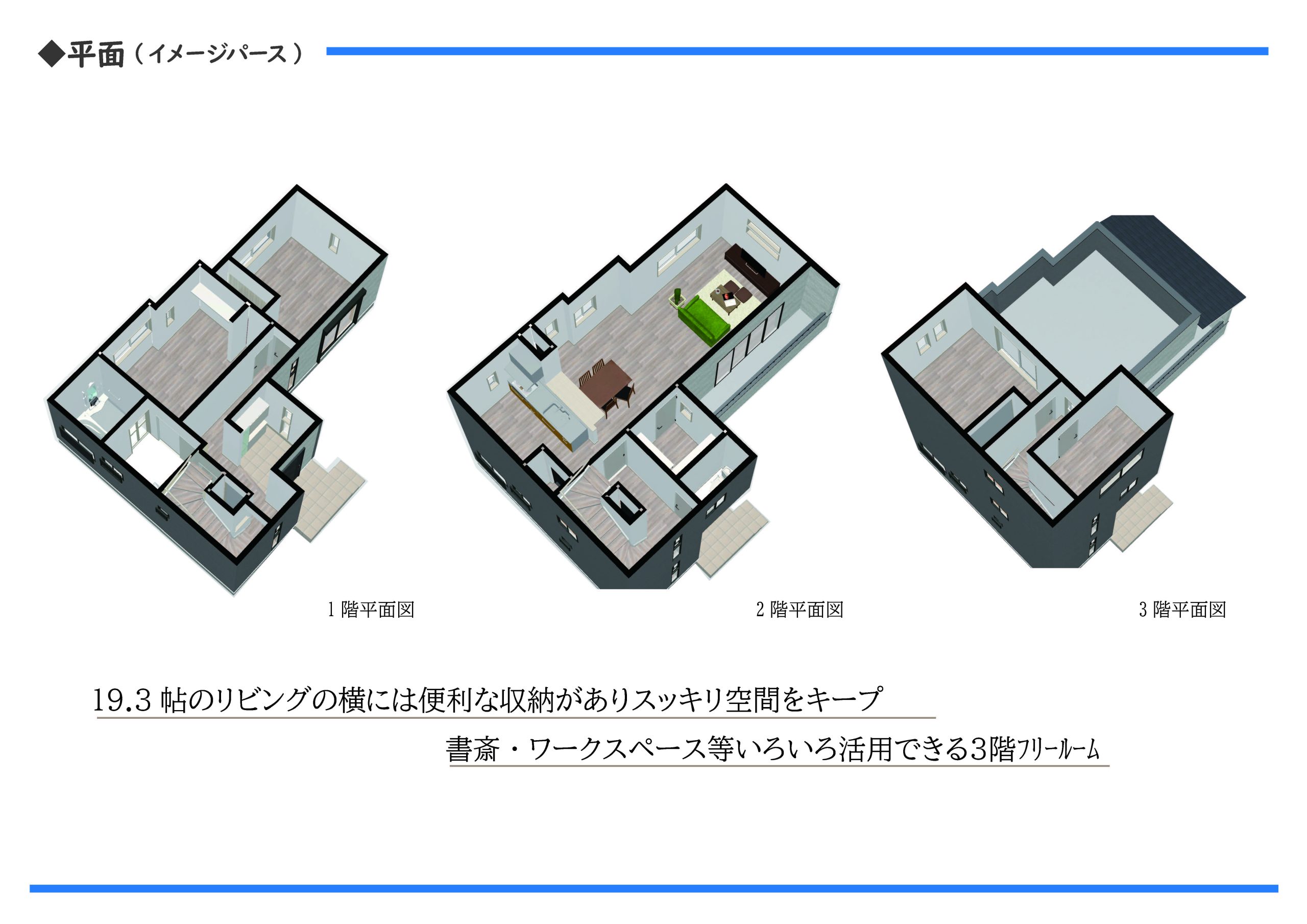 | 間取詳細 | (1階)洋6.3、(1階)納戸6.7、(2階)LDK19.3、(3階)和6.2 |